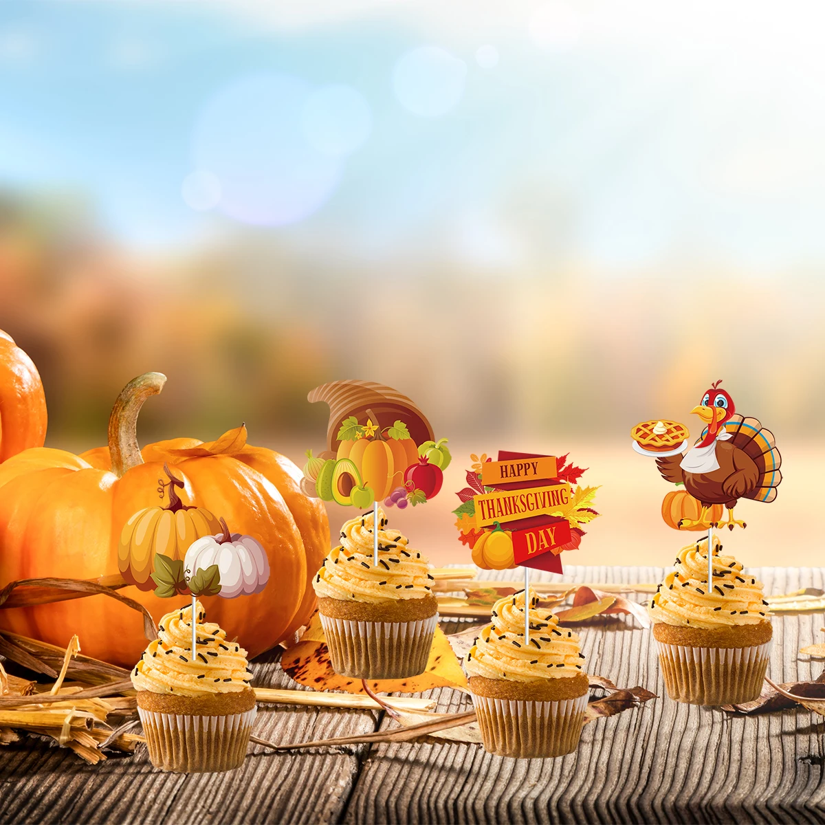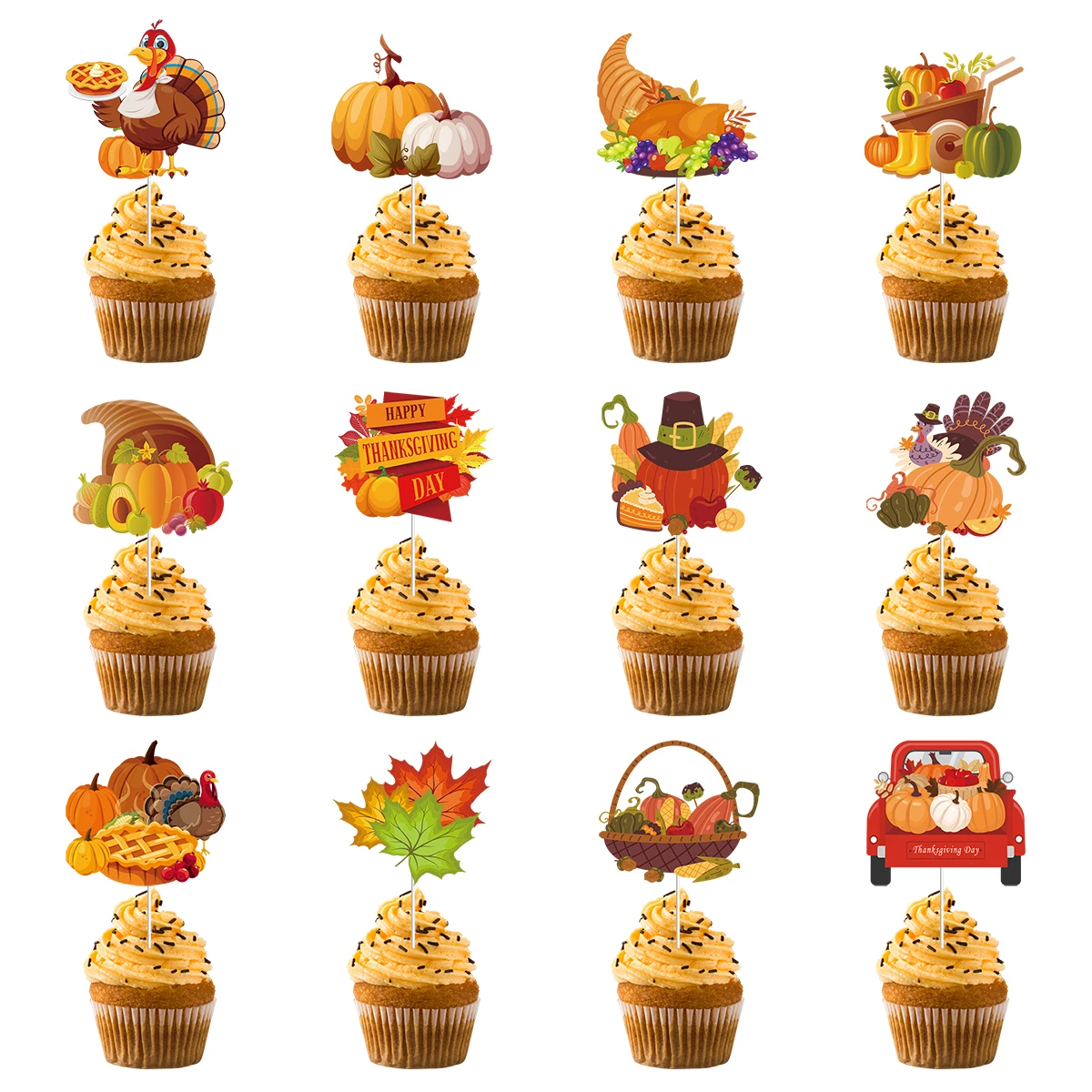 12/24pcs Thanksgiving Cupcake Topper Pumpkin Maple Cake Topper Fall Themed Turkey Food Picks Autumn Thanksgiving Cake Decoration